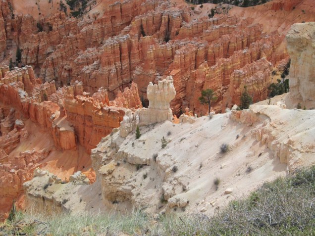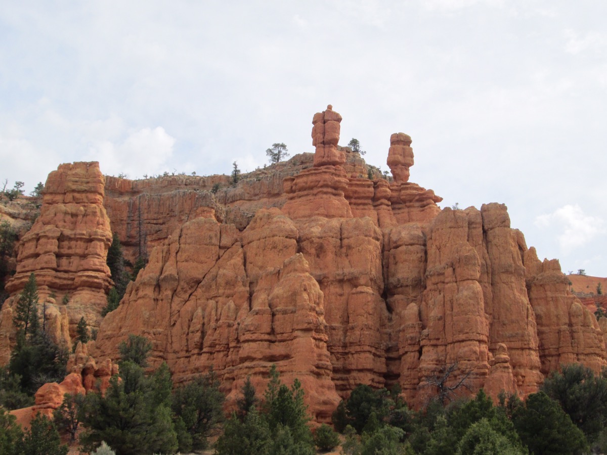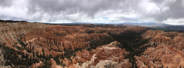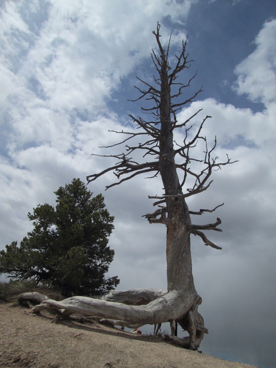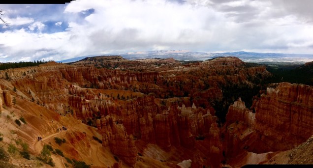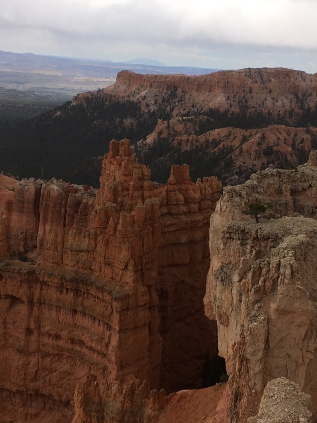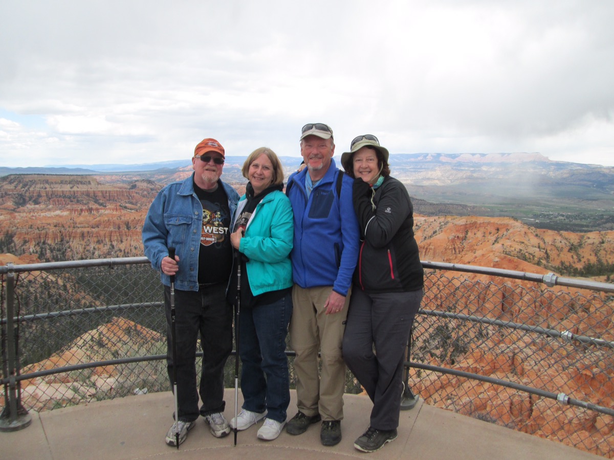 Bryce Canyon today. In my view, this is the most wondrous sight yet. I don’t have words to describe the wonder of this Park. The weather was a little cool, but much more comfortable than earlier days. We drove about 2 hours to the park entrance and took a shuttle up to the farthest and highest (8300’) overlook, Bryce Point. I got to see “my” hoodoos at last. These are wondrous columns of rock that have been formed by erosion over millions of years. The process of creation continues with each rain storm, snow melt and even strong winds. In an area called the “Amphitheater”, there are thousands of hoodoos. (Love that word!) Didn’t see any resemblance to people I know, I’m sorry to say. Though the ordered ranks reminded me of pictures of the Terracotta Army depicting the armies of China’s first emperor, or maybe a stuffy upper crust audience at Carnegie Hall. (There is about that much motion.)