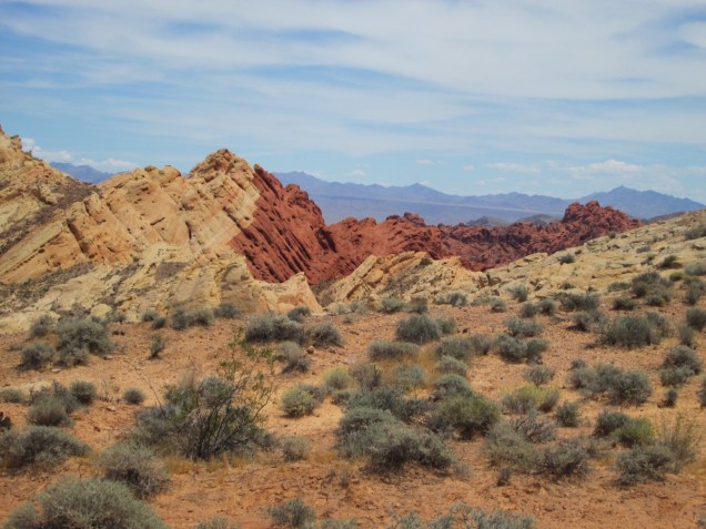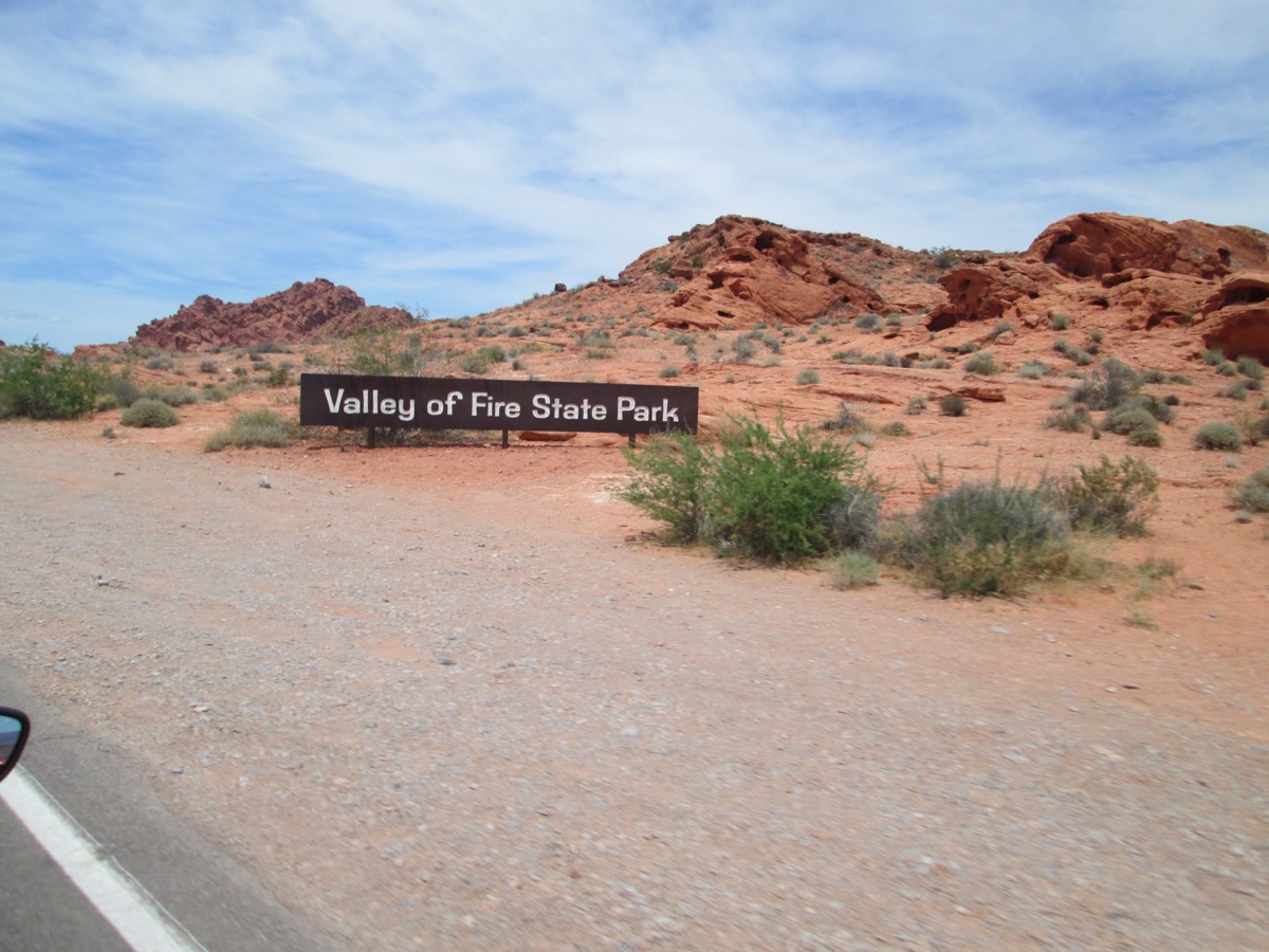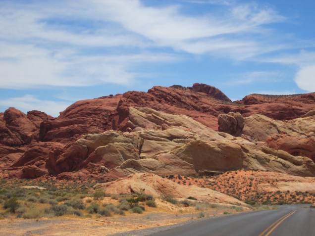 We headed out toward Las Vegas (Lost Wages) to see the city all lit up and get the bike serviced tomorrow. On the way, we stopped at the Valley of Fire, an Arizona State Park to see .. wait for it … more red rock. Though this is a deep, fire pit red that seems to glow at mid-day. There are contrasting domes and strata of silicate rock that are bone white that make the red just pop. And the tectonic forces that forced the layers of rock to shift shift millions of years ago created fantastic shapes with unlikely names like the Seven Sisters, the Beehives and the Elephant. Gorgeous. And the ride was a lot of fun winding through breaks in the rock formations, lots of curves and changes in elevation in this dry and very hot desert.