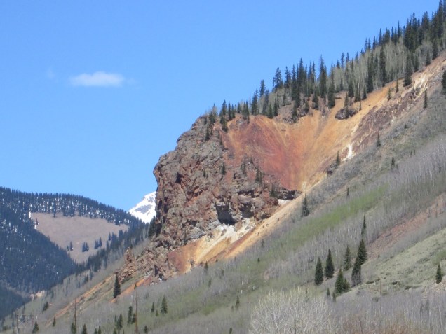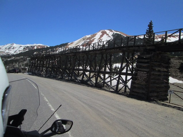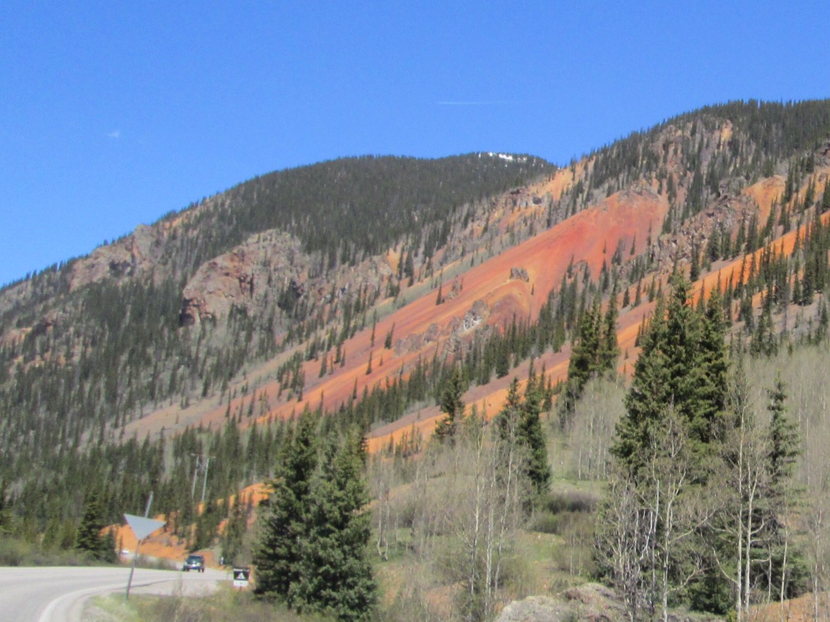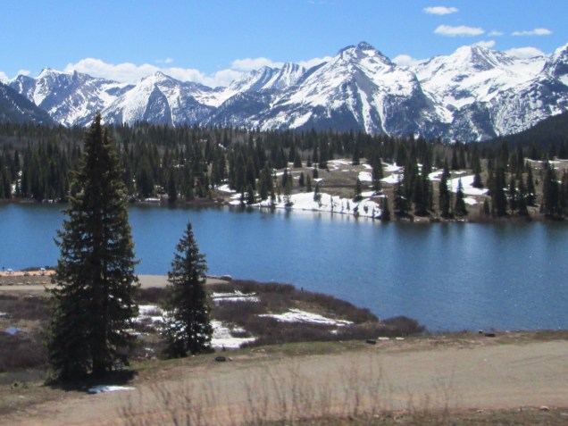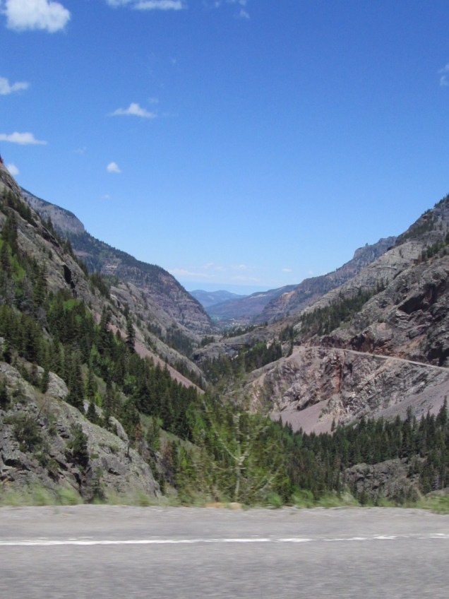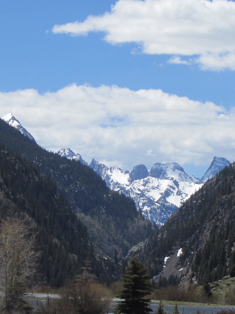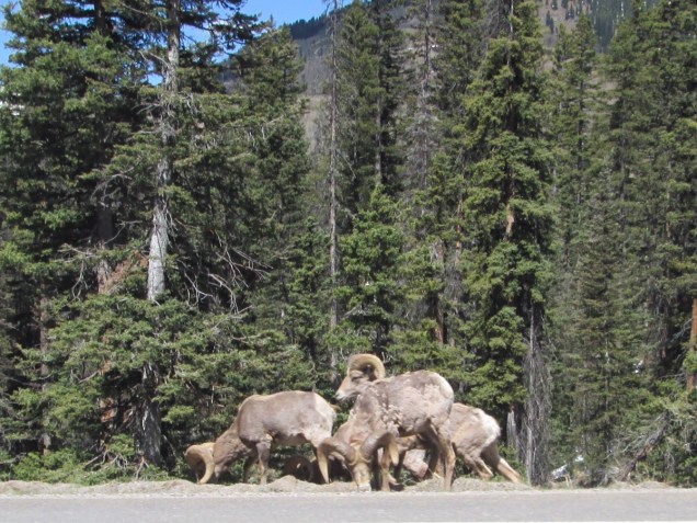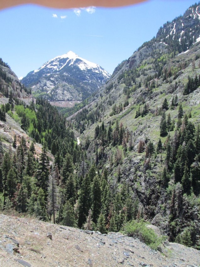 The ride to Durango was quick and a bit cool. You don’t expect 50 degrees in Jersey in late May. We had breakfast and then set out on the road north, US Rt. 550 aka “The Million Dollar Highway.” Over the next 75 miles through the San Juan mountains within the Rockies took us from a little over 5,000 feet to over 11,000 feet, through three passes (Coal Bank Pass, Molas Pass, and Red Mountain Pass.). The town of Silverton sits between the 2nd and 3rd passes and offers a great chance for a break. The route was created as a mining support road and built for the stage and a narrow gauge railroad to transport ore for shipment. Before debouching in Ouray, CO there are a multitude of hairpin turns and switchbacks with tremendous drops off the roadway. I am tickled to say we made it in great style and grand fashion (beats the alternative) and we saw some fabulous sights. You’ll notice some stunning pics of snow capped mountains, water falls, and even some Rocky Mountain Longhorn Sheep: we were much more impressed with them than they with us. Although traffic came to a stop, the sheep acted as though we all didn’t exist. (Human conveyances can continue their way when WE decide to give up our road, thank you.) An amazing ride and we’re proud of ourselves for making the trip.