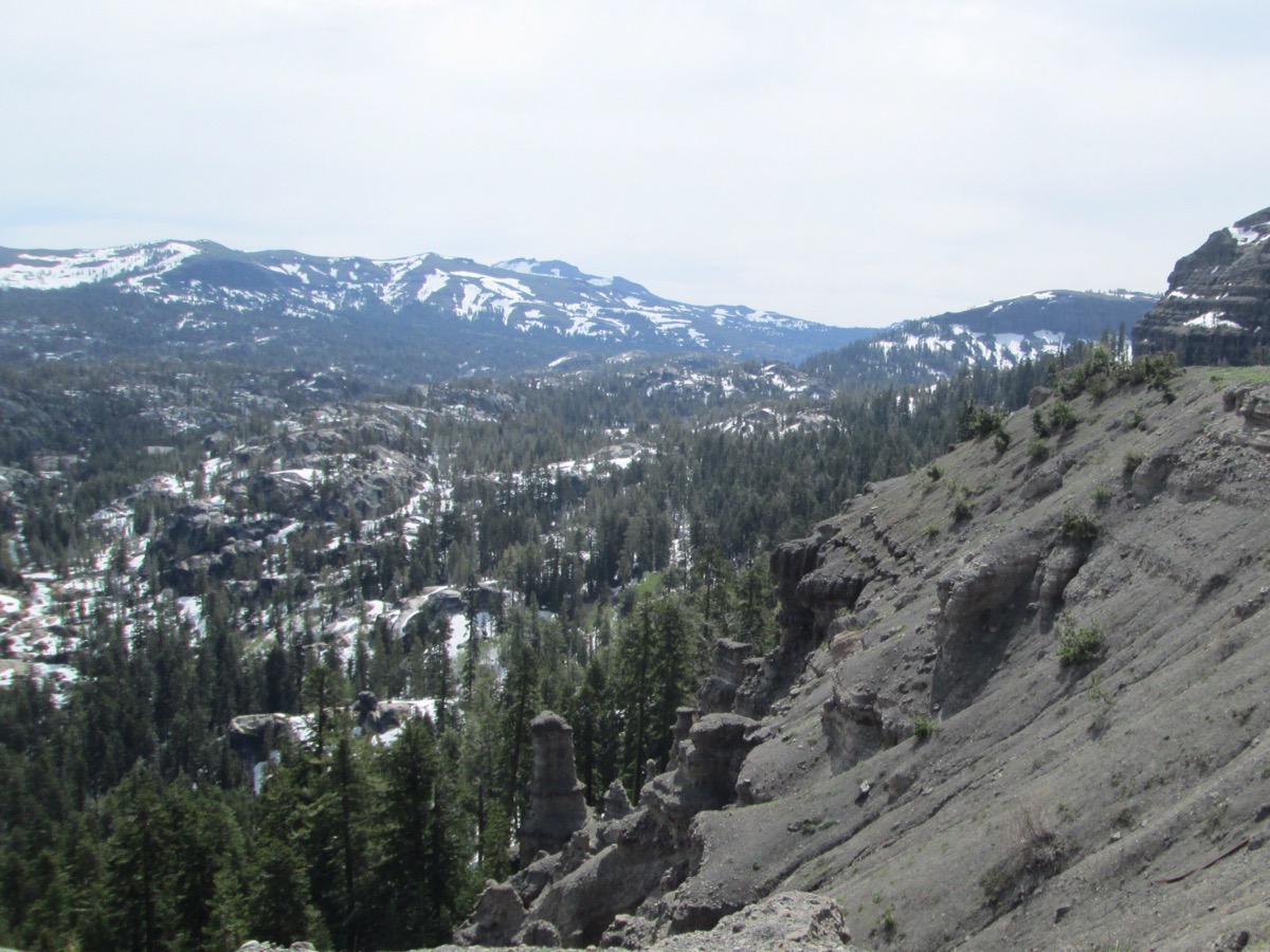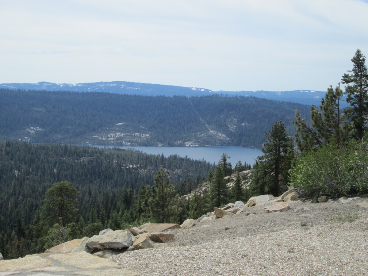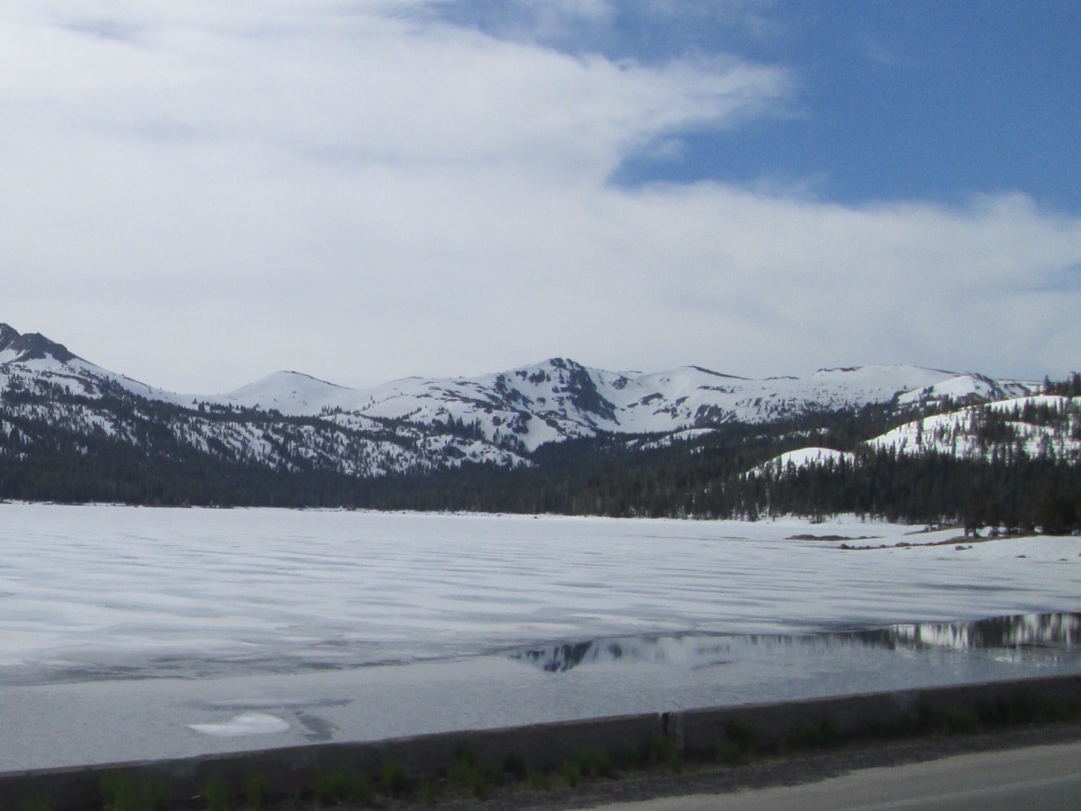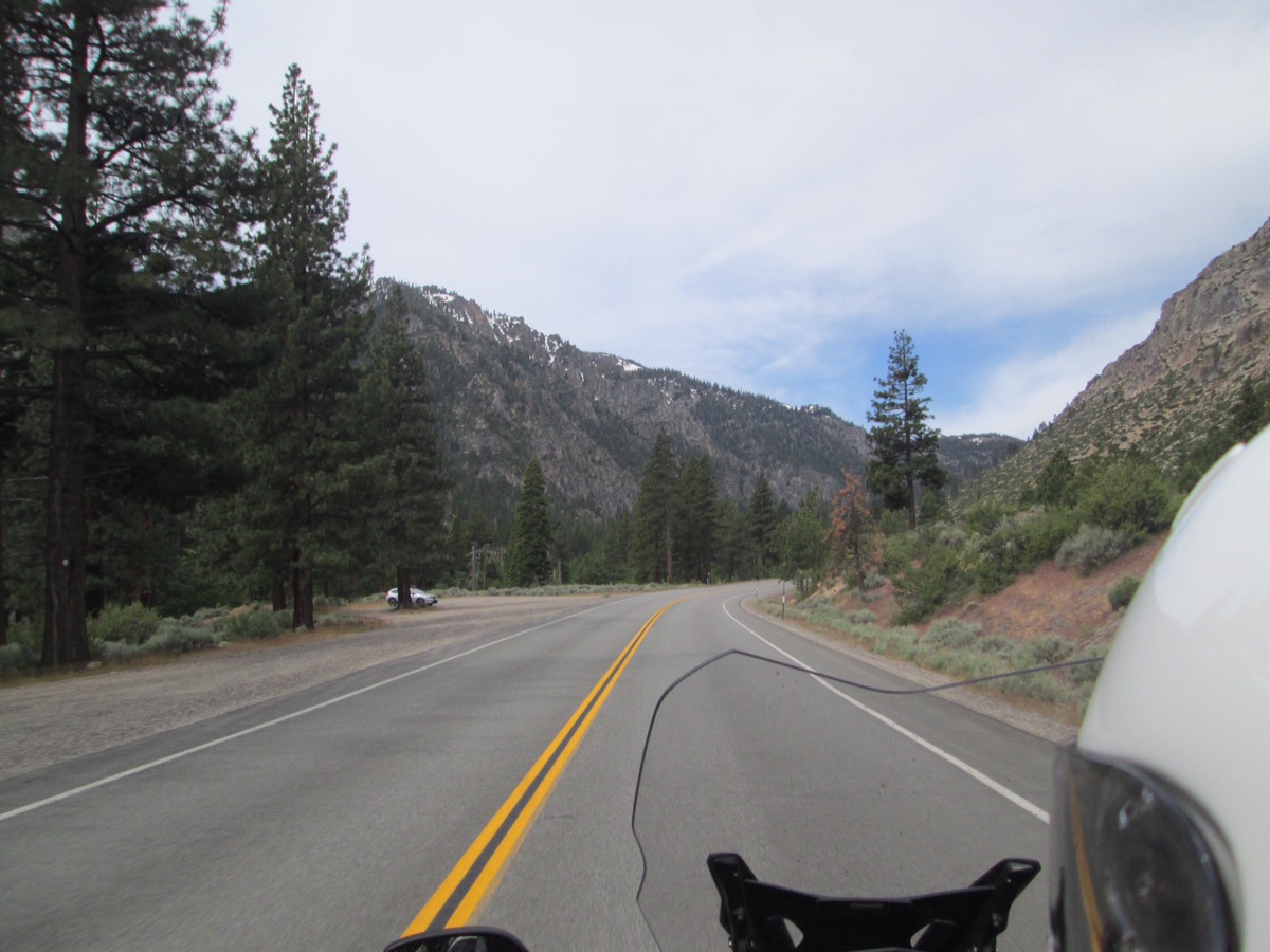 On the way out, we also got a last look and some pics of the snow capped Sierras from the east. Then we rode up into them for a more intimate encounter on Rt 88 which took us through Carson Pass (alt. 8400 feet) and some slightly lower roads. At points the snow pack was still 10 feet high at roadside, and a number of lakes are still frozen even this late in the Spring. The sights and nice twisty roads made the trip over the summit a lot of fun.