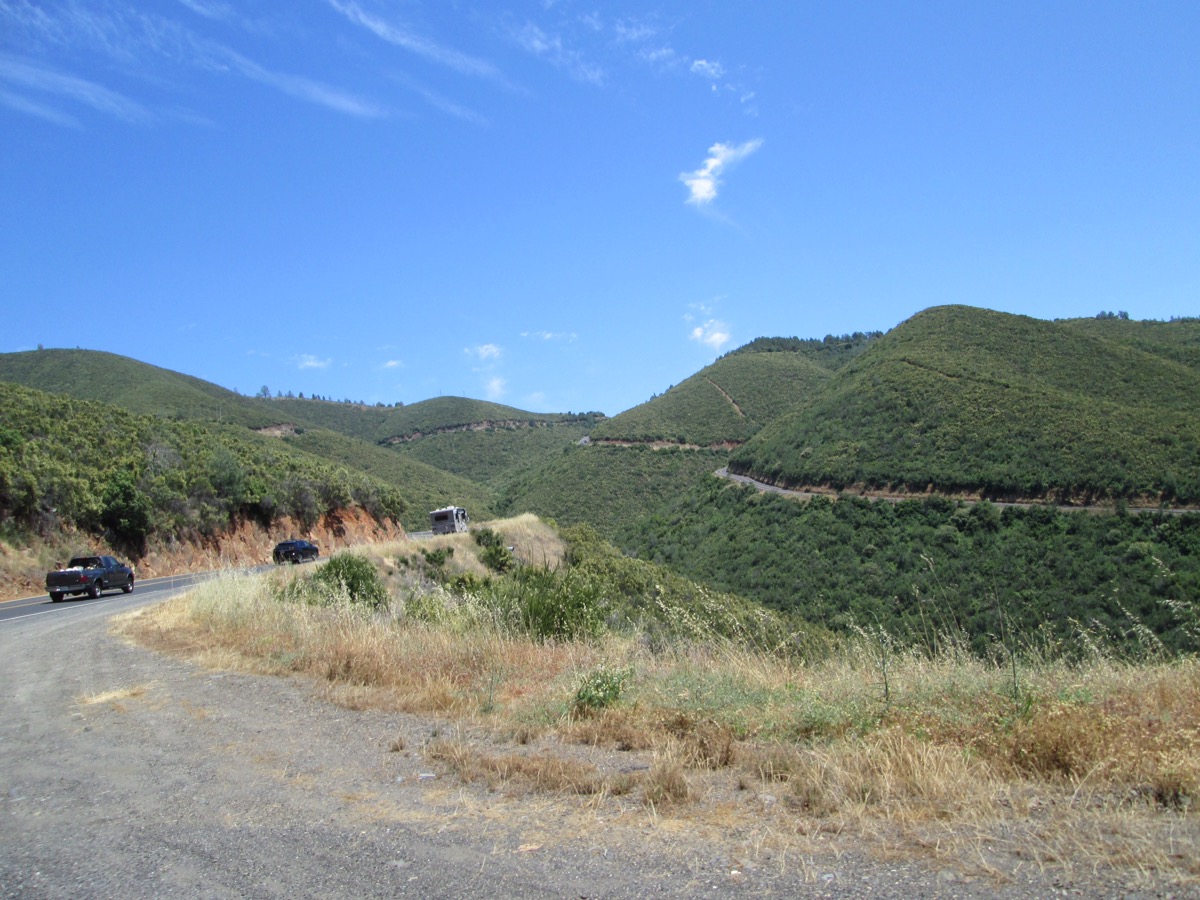 We picked up Rt 49 which led us a merry chase up and down a number of mountain ridges with switch backs aplenty. The road signs cautioned we take the curves at about 20 MPH and rightly so. Very fun but we had to pay attention. Historically, Rt 49 was built to service the original 49ers (1849 gold rush) who mined the area for gold and silver. Silver was more common over the area we rode. Almost sorry we didn’t stop to stake a claim.