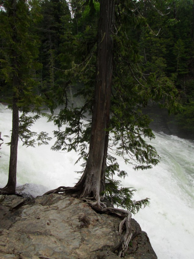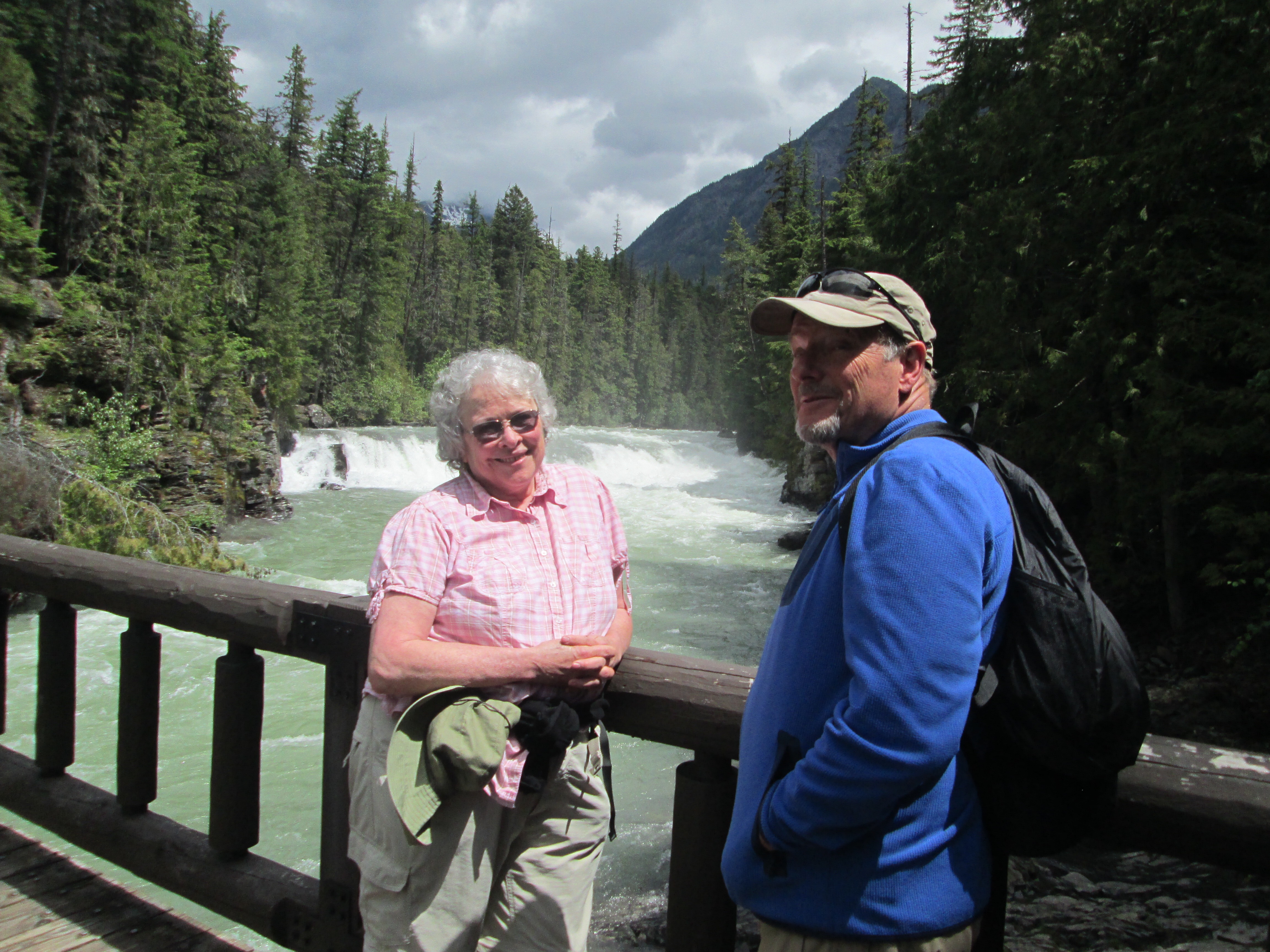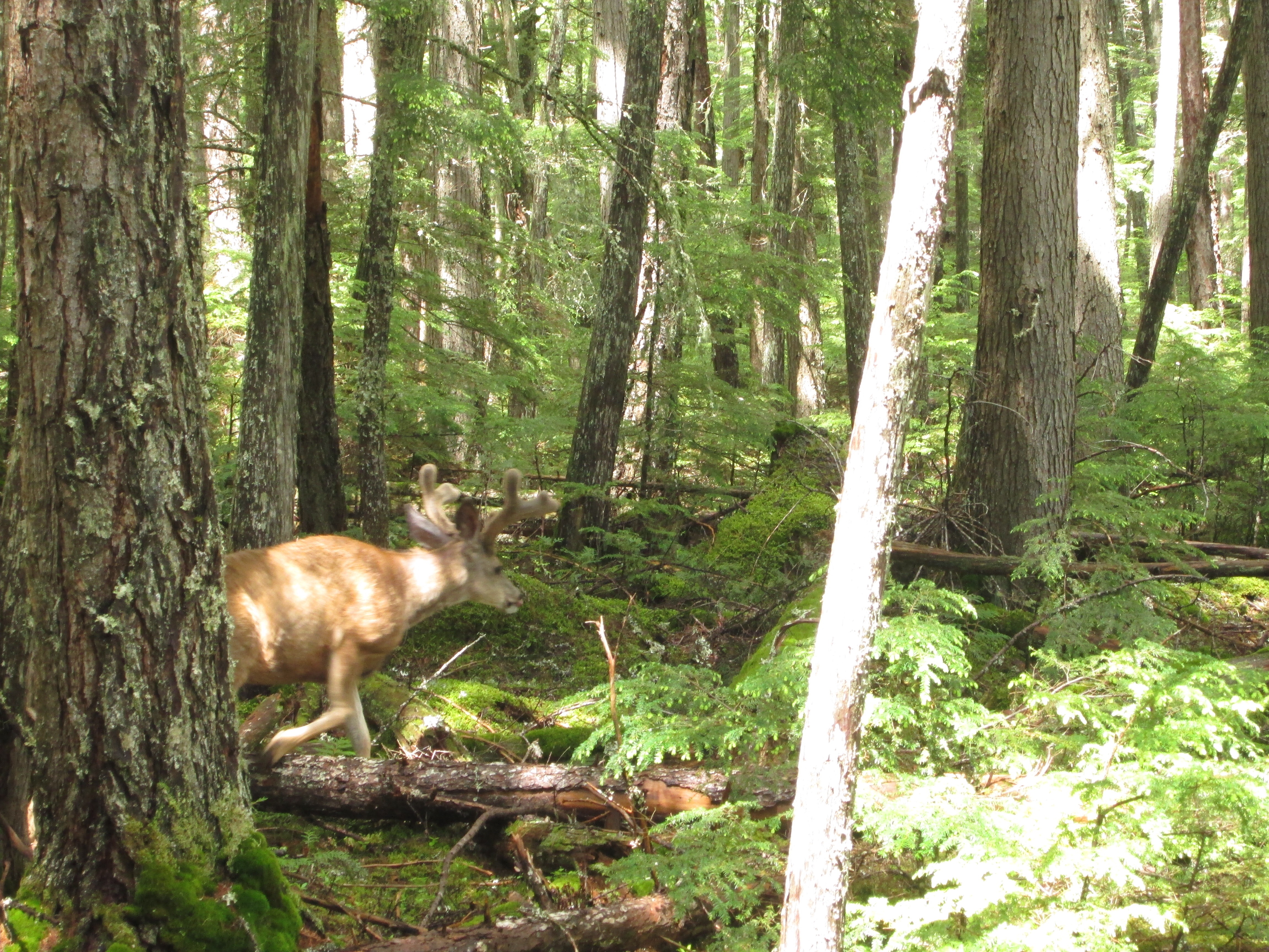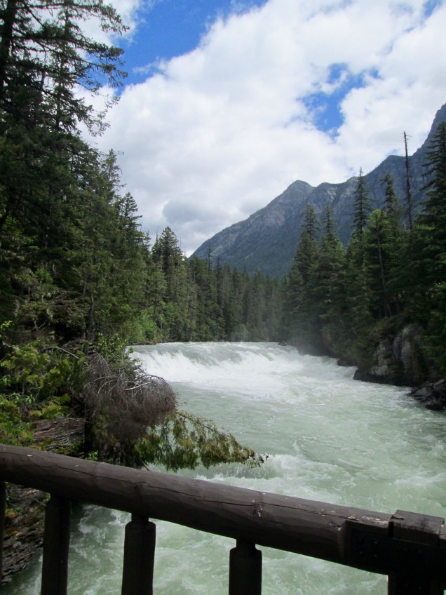 We continued along the loop trail back to the road where the swollen McDonald Creek came to a fall that thundered beautifully, plume of mist thrown into the air. There’s a bridge that spans the falls and it’s so energizing to have so much water roaring underneath. The trail took us downstream by several rapids and falls on the creek’s way to Lake McDonald. Unlike the riders and youngsters hurrying along because they can, we made our way easily and with dignity just enjoying the pleasure of good company and the beauty all around us. We met a buck close to the trail who was sporting a new 8-point rack. His horns were covered in velvet and which will likely rub off by summer’s end to reveal new larger, hard antlers. Like the does we have seen, he was looking for something tasty, and utterly unconcerned about human proximity. We got a pic. If we were in a hurry, we might have missed him. Dignity has its rewards. (Ben, Dave and Tim: Hush. It’s our story so mute the Flintstones theme.) 😀