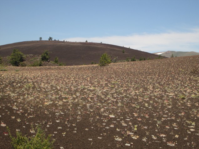 Toward the end of an eruption, a volcano will often throw hot gases and specks of lava into the air. Upon cooling, the specks fall to earth as cinders that can create a huge mound around the vent. We saw many, and climbed one about 600 feet high. It would have taken modern humans a very long time to build such a mound even with modern machinery. And the view from the top was awesome, not only because of the extent of the flows, but the significant amount of plant and animal life that has taken hold and flourished in this alien landscape that endures great extremes of cold and heat and fierce winds.. The tenacity and variety of life is beyond amazing. You need to come here.