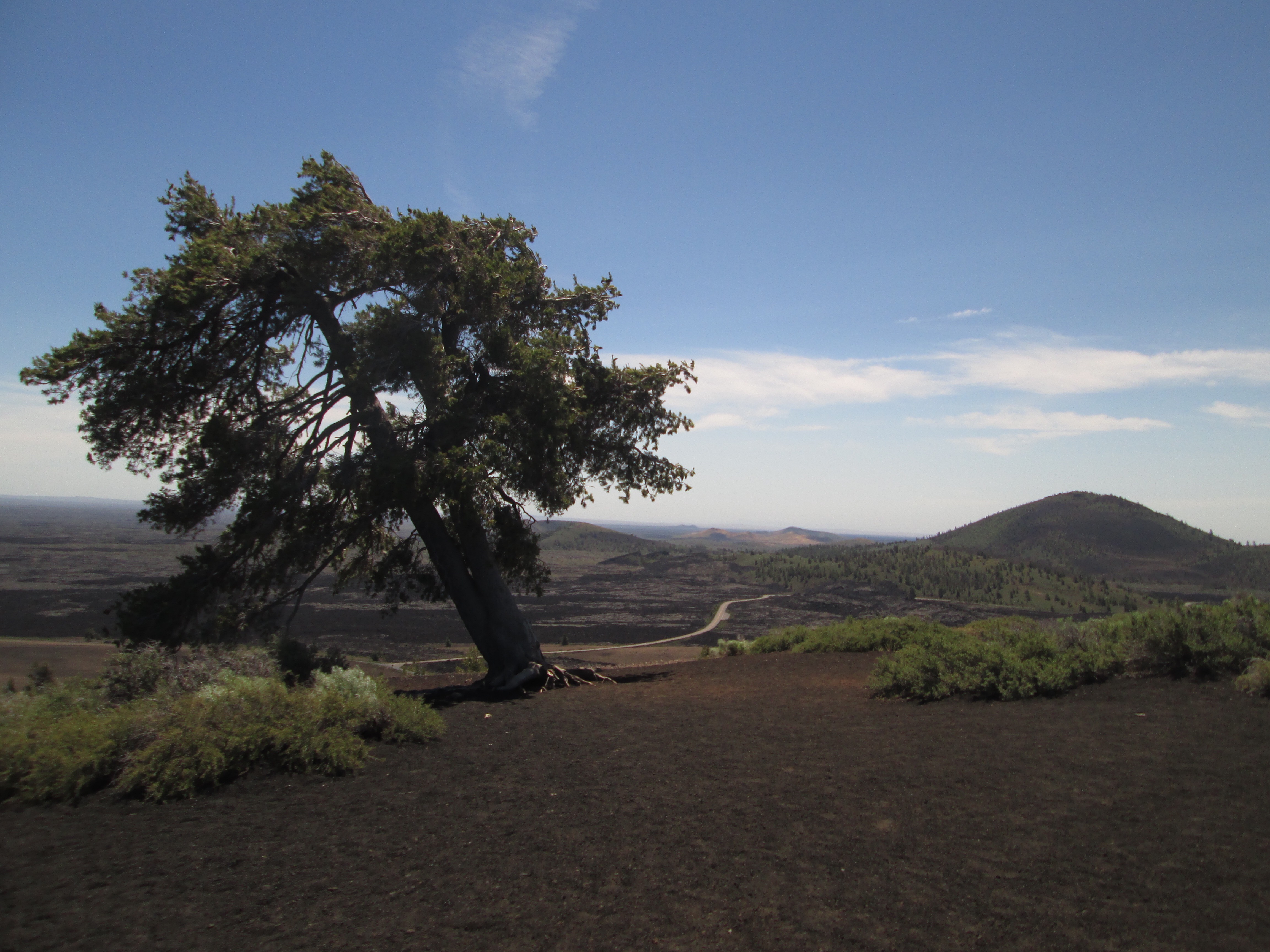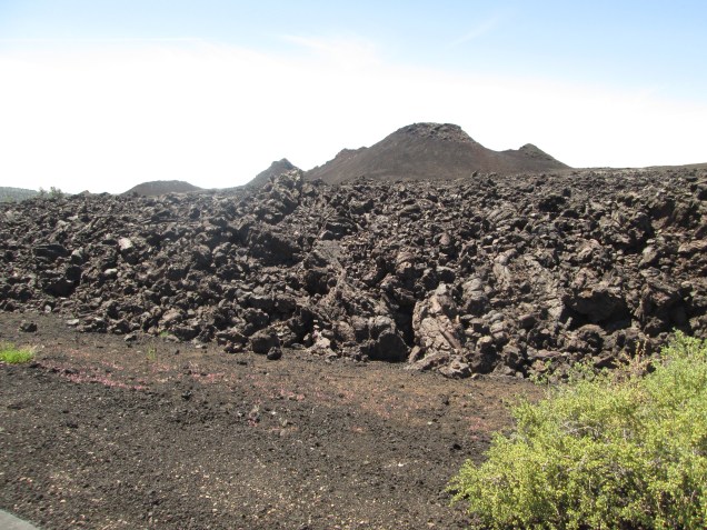 There is a hotspot in the superheated magma under the North American plate. The location of the spot remains constant, but the location on the plate changes as the plate creeps along. The hotspot is under the Grand Rift, a fault line about 40 miles long running east to west. At 2 inches per year, it’s been moving slowly for over 60 million years. The hotspot has been located under the Craters area for at least the past 15,000 years. There have been at least 8 eruptions in since then, the most recent about 2,100 years ago. Lava in two forms flooded the area in thin sheets that transformed an ordinary landscape into fantastical terrain. (the terms are Hawaiian and just tickle my ear bones.) “A-a”, pronounced “ah-ah”’is faster moving lava that cools in a way creates choppy/chunky fields that look jumbled and chaotic with abundant sharp edges and uneven footing. Think of the sounds you would make walking barefoot on sharp stones. The other is called “pa-hoe-hoe”, pronounced “pah-hoi-hoi”, which is created when thinner, slow moving lava flows from the vent. This lava is generally smoother and may create ropy structures. Both types are on prominent display and have created an unearthly, dramatic landscape. As you may have deduced from the eruption schedule, another eruption may be due in the near geological future – made us wonder if today was the day.