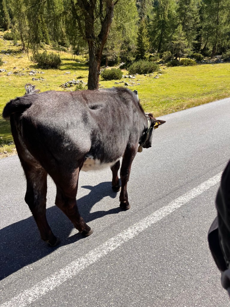 A bit later, we rode by some substantial leavings in the road that were both abundant and distinctly aromatic. Sure enough, we came to the source: a half dozen cows lounging and frolicking (?) about the roadway. Real free range cattle! Unlike our encounter with a herd of cattle in Colorado on our tour in 2017, the cows weren’t alarmed. No one seemed put out. We all just eased on by each other while trying to dodge the bigger road apples.