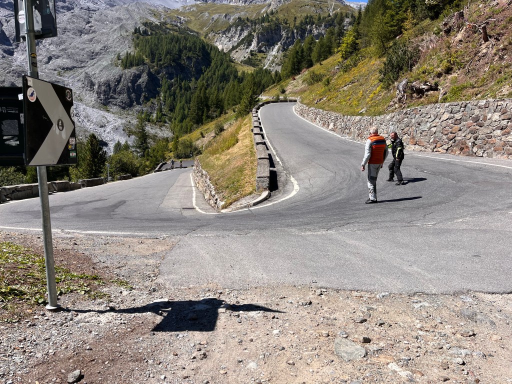 Planned in 1818, this pass road was built in 5 years (1820-1825) by about 2,000 workers. Because horse-drawn vehicles were state of the art, the gradient was limited to a maximum of 11%, which is still pretty steep. (We’ve ridden on hill grades as high as 16%.) The road to Stelvio Pass was was built on an ancient trade route dating back to Roman times to move goods between Switzerland and the Duchy of Milan, Italy.