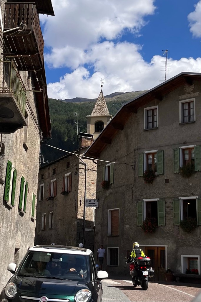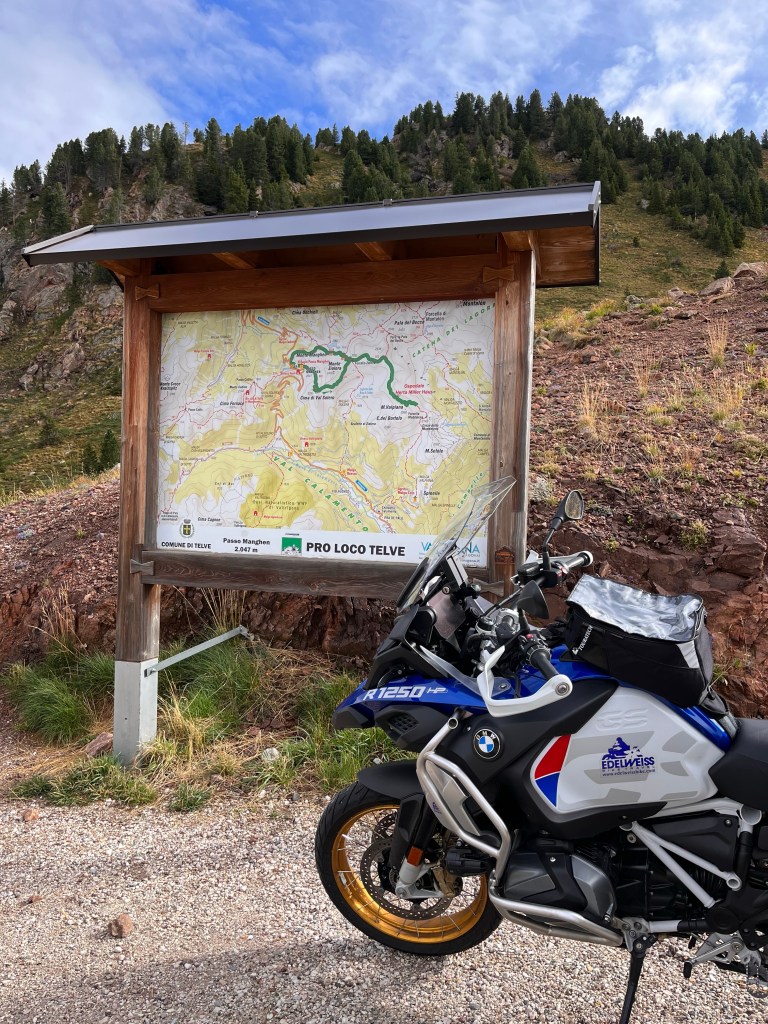 Our first pass was Passo Della Mendoza (Mendel Pass), which opens a path between two Italian provinces, South Tyrol and Trentino. This pass has long formed the border between the German-speaking and Italian-speaking regions of the Tyrol region. Bolzano is a town founded by the Romans over 2100 years ago and has been a trading center for most of that time because it’s almost dead center between Venice and Augsburg, Germany. Remember, control of the roads was essential to regulating, enhancing, and protecting trade. That’s why so many Alpine roads have such ancient origins and have been continuously improved over millennia . Our rides take advantage of these centuries’ old routes for our riding pleasure.
