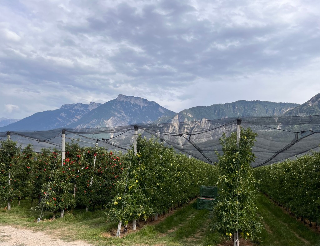 The morning briefingHairpins leaving Penegal – see how they stack up?!This is a road. With a bus coming upon a bike. This is normal here. 😳SighThe first bike is our tour guide, Michael. So many vineyards. So many mountains. Fun!The beginning view of the DolomitesWe’re bike #3 A fellow rider shared this with usRiding through apple orchards