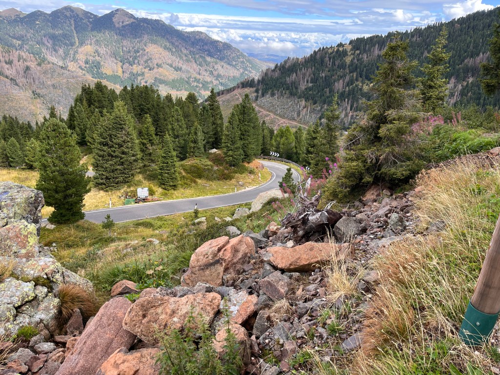 After a few kilometers’ warm up on well-maintained roads, we turned onto the Passo Della Erbe, also known as the Würzjoch (“Würz” means spicy!), a relatively unknown, single-track pass with great views. The road looks intimidating because it’s about the width of many bicycle paths in the US. This is especially true when you meet oncoming traffic in the form of a bicycle, a motorcycle or even a car! It turns out there is sufficient room for multiple vehicles to pass each other safely. We’re just used to (spoiled?) much greater room on most American roads. Whereas we had freaked earlier in the week when confronted with narrow lanes, by today we had gained sufficient experience to ride smoothly and confidently no matter the conditions.