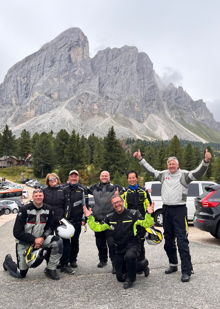 Today was by far the longest and most beautiful day so far. We left our Hotel in Levico Terme and rode over 270 kilometers (nearly 170 miles) to Oberrasen, Italy through the heart of the Dolomites. We cleared seven passes with a combined more than 150 hairpin turns and over 1,000 curves. (Yes, someone actually counted them!). After the tough and tight switchbacks of Passo del Stelvio and others early on, these turns were challenging but so much fun!