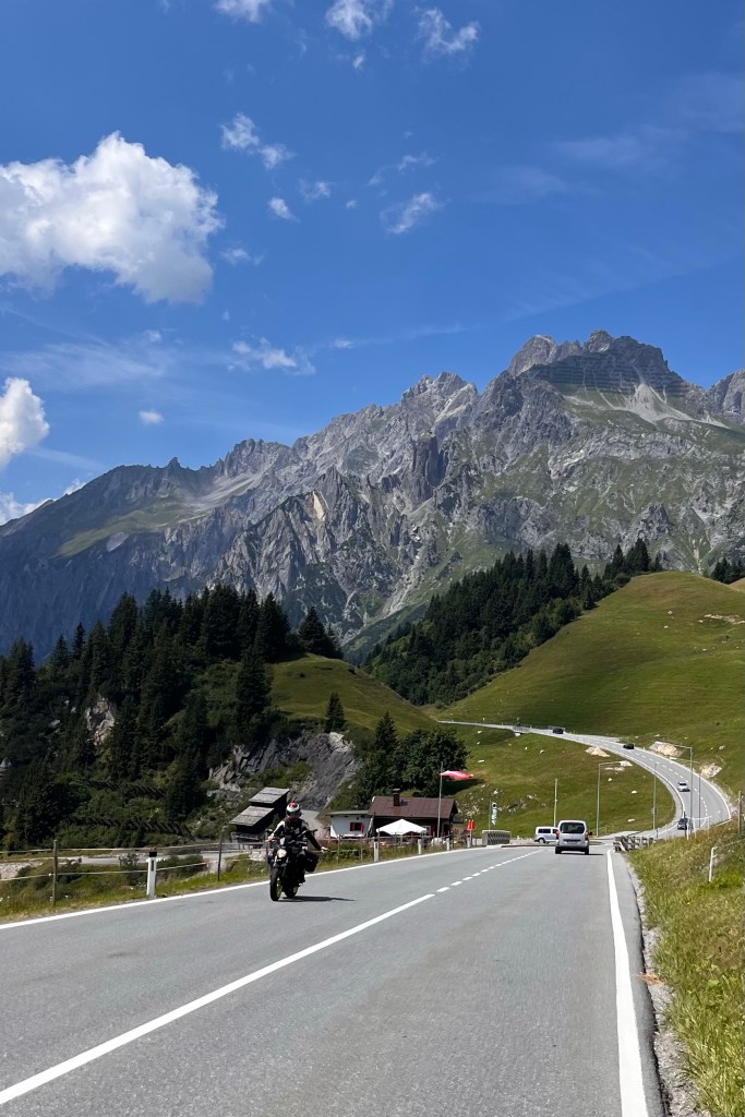 A word about the weather. Back in Morrisville today it’s about 100 degrees F. In Paris, it was nearly 95 degrees a couple of days. In Mieming, Austria it’s about 85. At the top of an alpine pass, it’s usually much cooler, between 45 – 60 degrees. And windy. And often cloudy with little sun. Hmmm. That translates to a lot of coolness at 50 miles per hour on the back of a bike. Hence, you’ll notice we have pretty warm protective gear. And we plug the gaps very tightly. And sometimes we keep it all on when we stop. We’re seeking warmth, not anonymity. If you’ve ever ridden, or walked in a strong cold wind, you’ll know what I mean.
