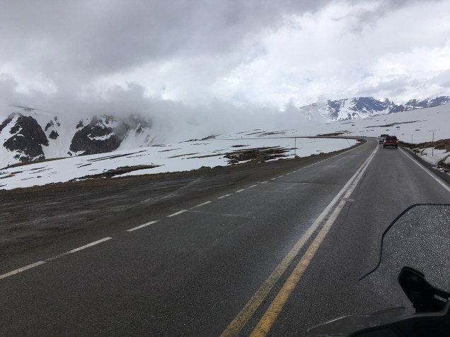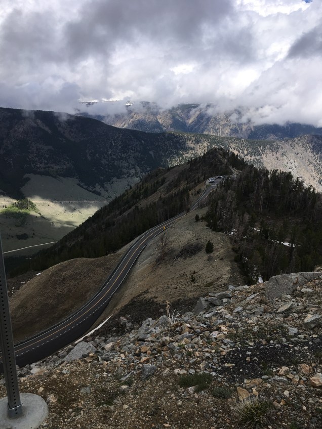 When we got to Red Lodge, the weather started to look unsettled with lots of clouds coming in. So we took a deep breath, put on an extra warm layer, and started the ascent. This is our second ride through the Beartooth Pass, though from east to west, opposite the last time. Lots of twisties, switchbacks, sharp cliffs on the outside and sheer red rock to the inside. There are plenty of pullouts to catch your breath and enjoy the spectacular views and we took advantage. As we climbed toward the top of the pass, a cloud moved in making the air very chill and reducing visibility to not very far. The road surface was good, though, so we made it through fine though it did boost our heart rates. 😀 It was fun!
