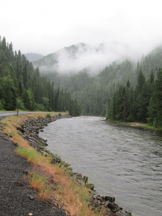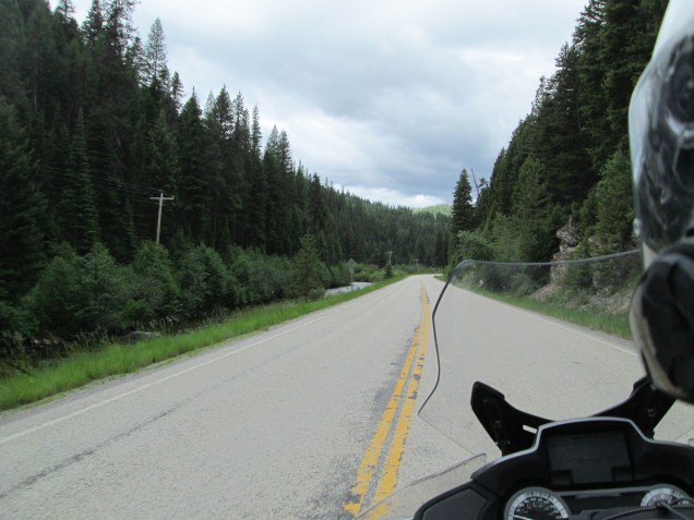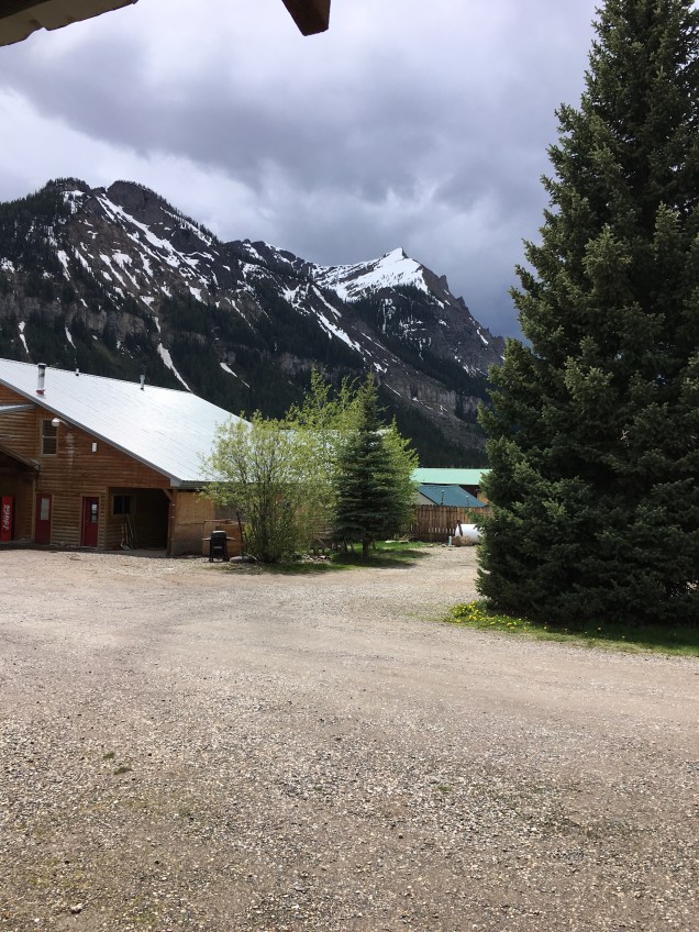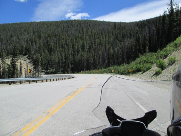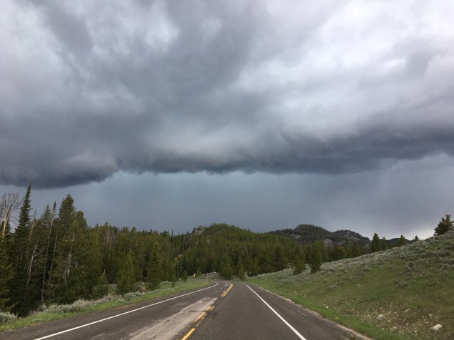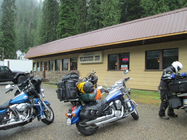We stopped at a rest area/convenience and souvenir shop called “Top of the World” to rest up and have some coffee. Talked to some fellow bikers and compared notes on the ride – it was fun. But then the sun started to hide again and we resumed our ride down the west side of the Pass. We almost made it before the clouds moved in again. And the rain. We pulled over when the hail started. And the thunder. We were/are very well protected and we’re in no danger. Pea-sized hail makes an entertaining tip-tap sound on your helmet and a stray ricochet finds an inconvenient gap in your collar for a bracing thrill. When the shower tapered off and we made our way to Cooke City for the night’s lodgings. We’d covered about 122 miles but were worn out from the fun.