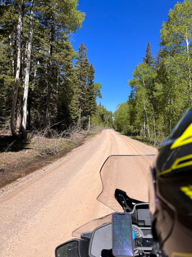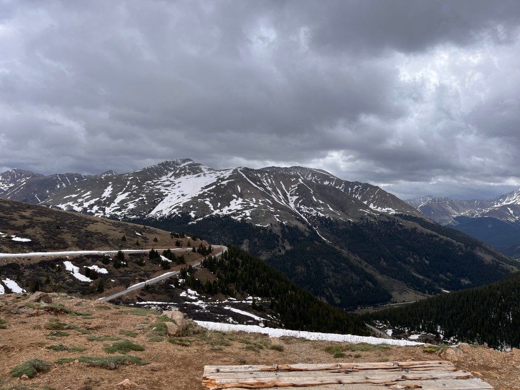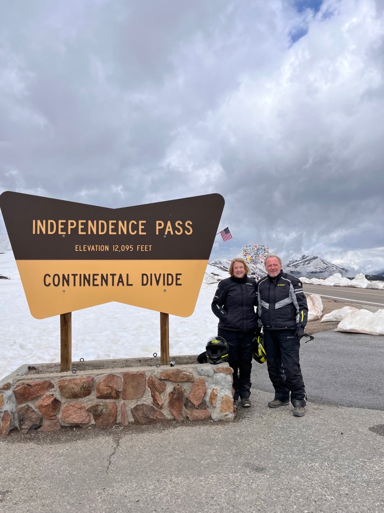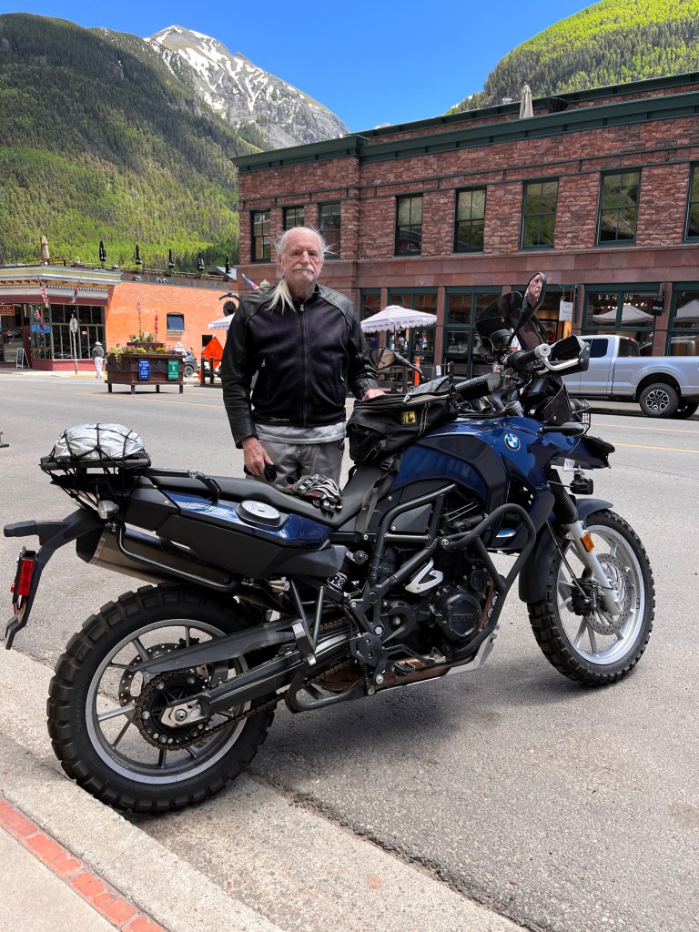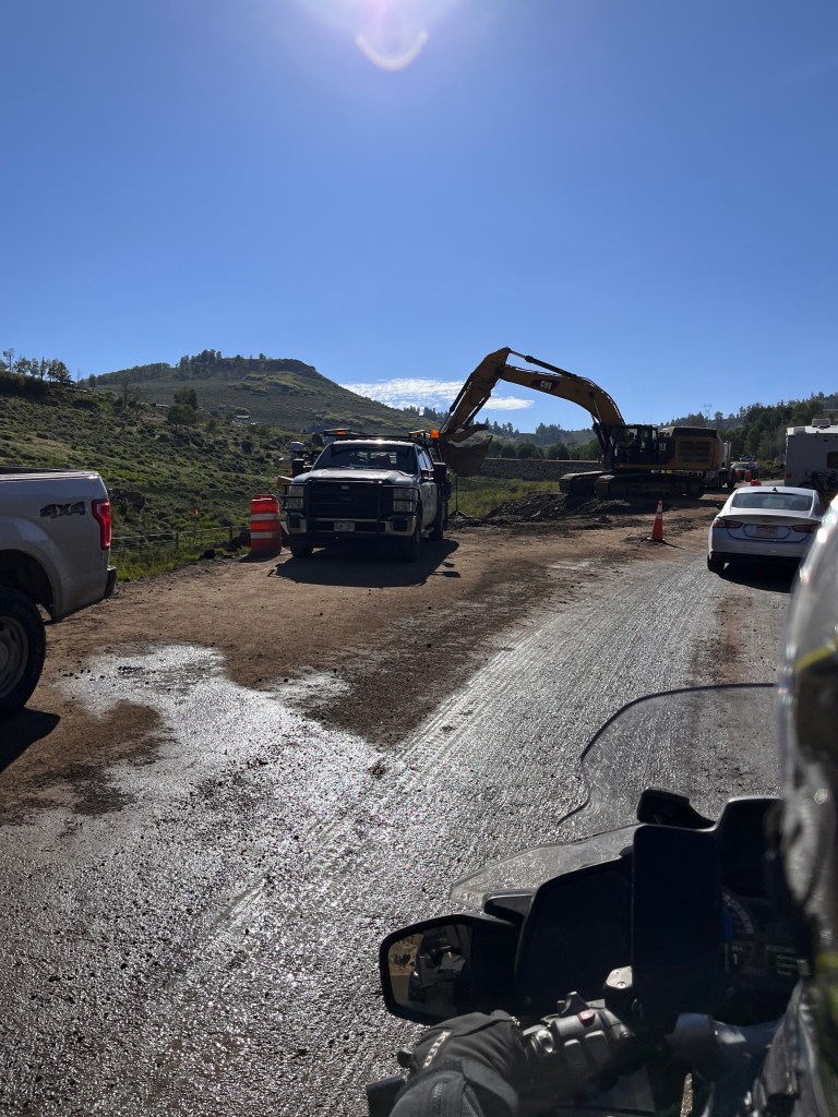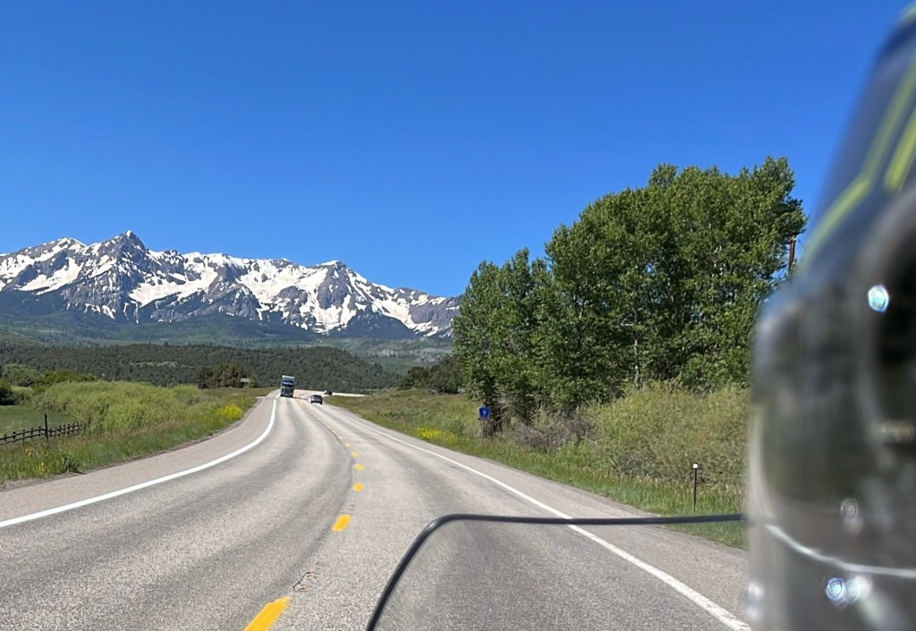 We hit stopped traffic just west of Blue Mesa Lake, the Black Canyon and the Gunnison River. We sat for only about 20 minutes before proceeding. Once through we turned onto County Rd 25 south which took us over a couple of passes and by some more gorgeous lakes and streams. The bike was fully loaded so we took our time through wonderful twisties and elevation changes. Then it was onto State Rte 149 and Slumgullion Pass at 11,500 feet. We wondered at the name and later discovered a “slumgullion” is a cheap or skimpy stew. Not sure what to make of that.