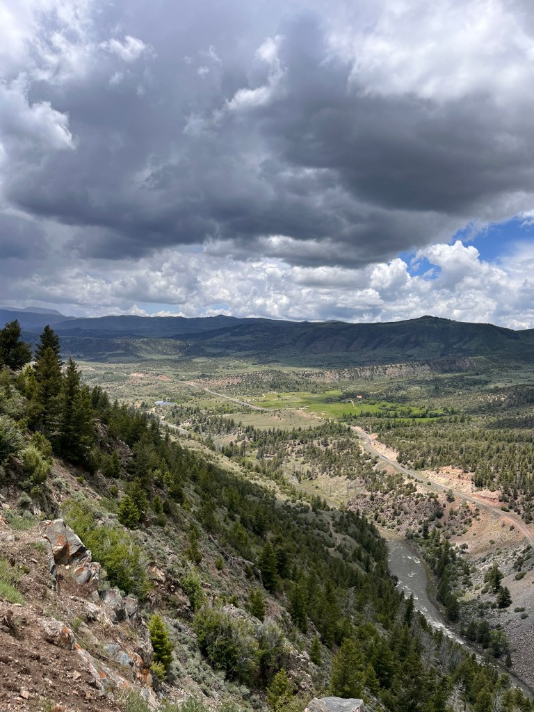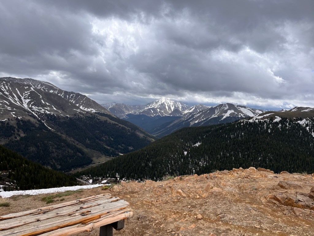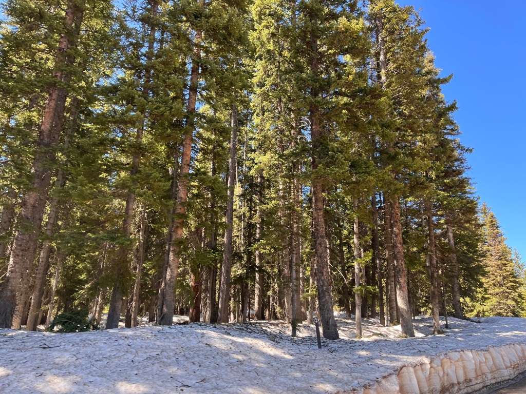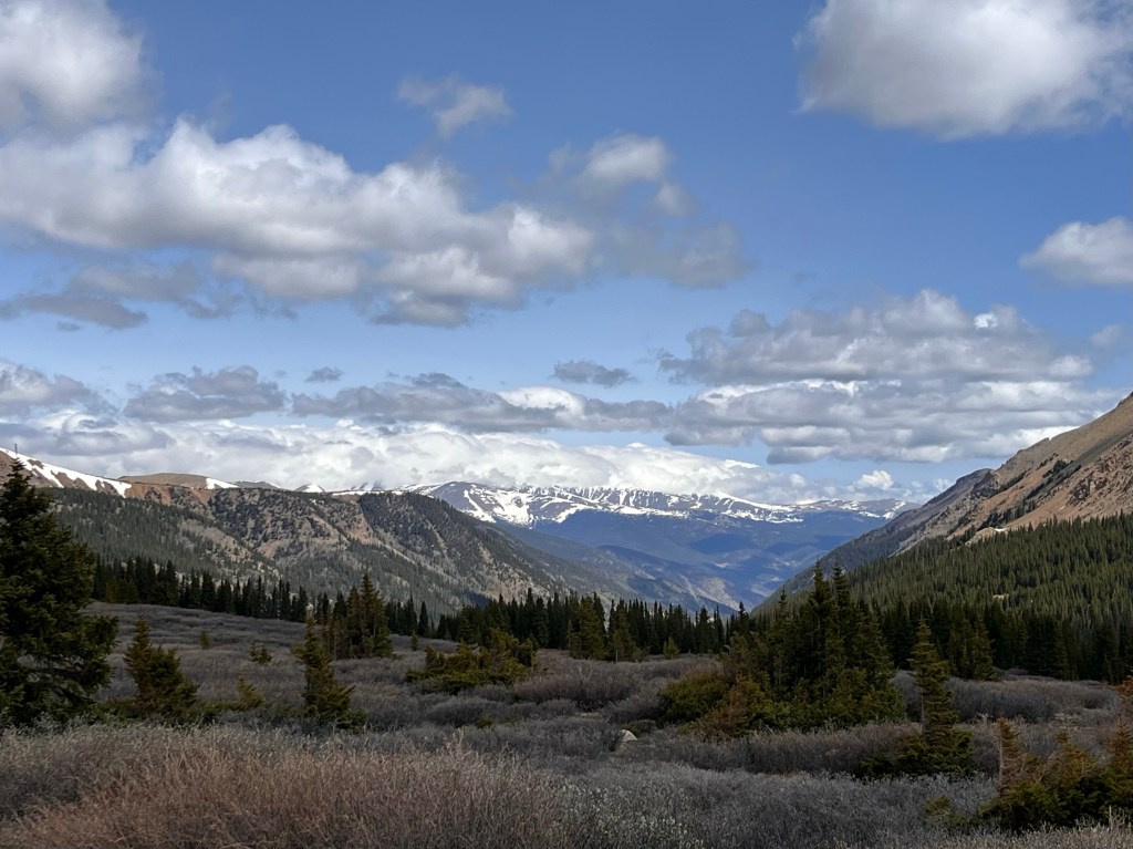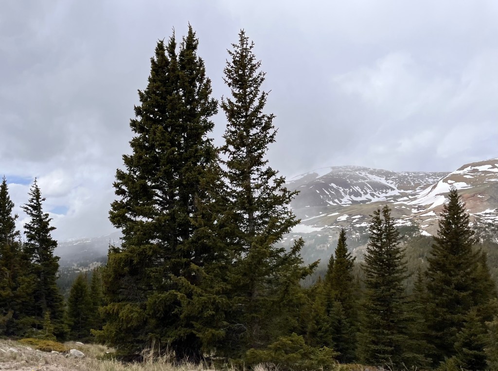 We hit stopped traffic just west of Blue Mesa Lake, the Black Canyon and the Gunnison River. We sat for only about 20 minutes before proceeding. Once through we turned onto County Rd 25 south which took us over a couple of passes and by some more gorgeous lakes and streams. The bike was fully loaded so we took our time through wonderful twisties and elevation changes. Then it was onto State Rte 149 and Slumgullion Pass at 11,500 feet. We wondered at the name and later discovered a “slumgullion” is a cheap or skimpy stew. Not sure what to make of that.